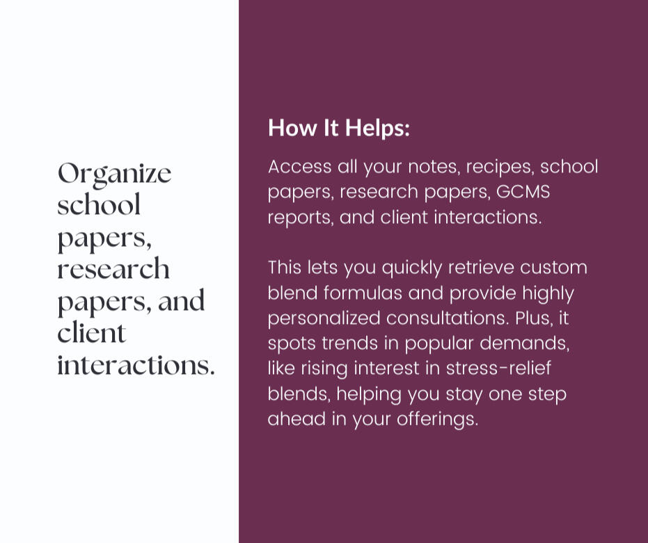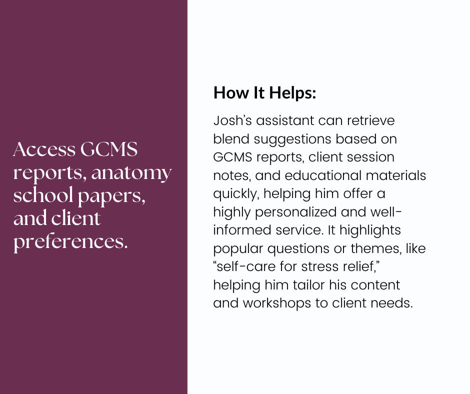 Ask the assistant any question related to your documents, and it will respond with the answer, along with the exact source. Whether it’s a research article, a blend recipe, or client information, you’ll know exactly where each detail came from.
